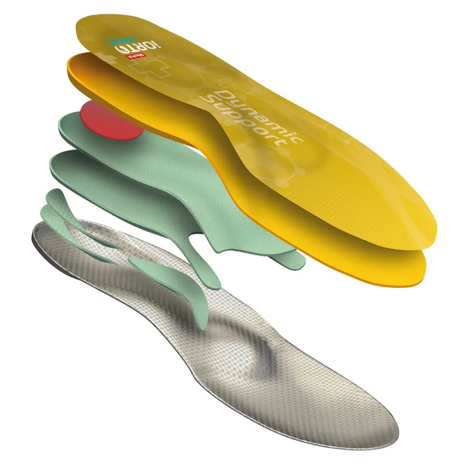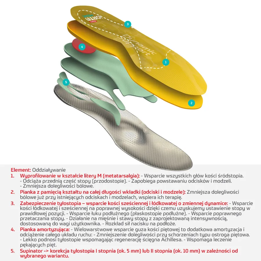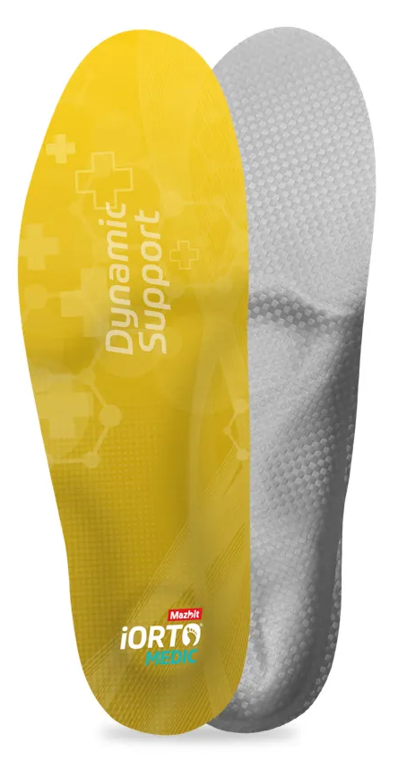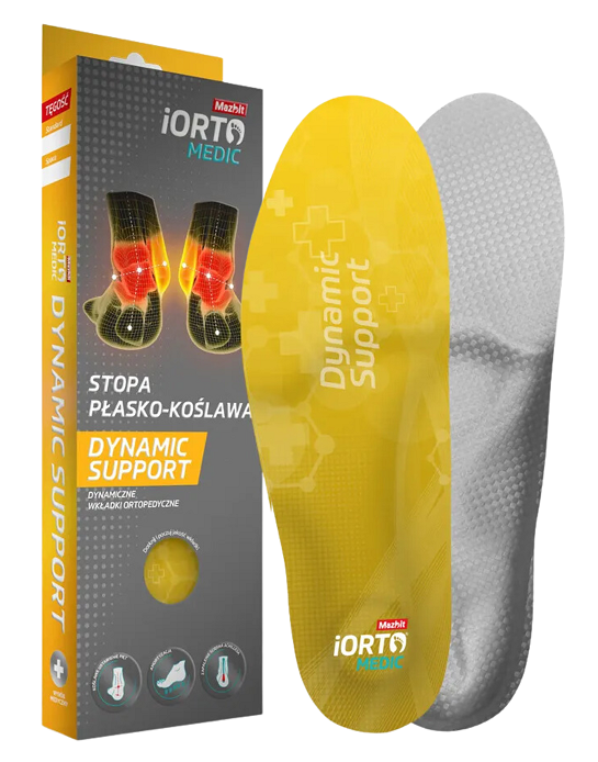 iORTO Dynamic Support to wkładki ortopedyczne, które pomagają zniwelować problem koślawości stóp, dodatkowo wspomagają leczenie zapalenia ścięgna Achillesa. Specjalne wyprofilowanie wspiera łuk podłużny stopy, zapobiegając płaskostopiu oraz ustawia prawidłową oś kończyny dolnej. Połączenie specjalnej wyściółki i pianki z pamięcią kształtu zabezpiecza przed powstawaniem odcisków i modzeli oraz zmniejsza dolegliwości bólowe także w obrębie łydek i kolan. Dodatkowo dobrze amortyzuje wstrząsy, dzięki czemu chroni cały aparat ruchu. Zastosowana technologia termoformowania zapewnia idealne dopasowanie do stopy, a wyprofilowanie w kształcie litery M odciąża głowy kości śródstopia. Wkładki posiadają specjalny supinator, który pozwala na korekcję tyłostopia, przy tym można wybrać stopień podwyższenia 5 mm lub 10 mm. Wyściółka wzbogacona została jonami srebra, które nadają antyalergicznych właściwości. Model został specjalnie zaprojektowany, żeby odciążyć kość piętową i jednocześnie ustabilizować całą piętę. Wkładki Dynamic Support to świetne wsparcie dla stopy płasko-koślawej, które zapobiega pogłębianiu schorzenia, a przy okazji zwiększa komfort podczas poruszania.