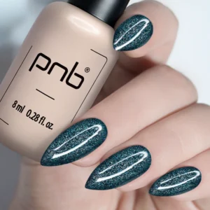 Ten Lakier PNB Azure 03 to unikalne połączenie głębokiej zieleni z błękitnymi, odblaskowymi drobinkami na ciemnym tle. To odcień stworzony dla kobiet odważnych i pełnych energii, który świetnie wygląda na paznokciach o dowolnym kształcie i długości, dodając stylizacji tajemniczości i głębi.