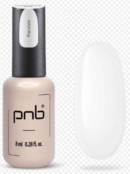aza kamuflażowa UV/LED, porcelana – elastyczna, miękka gumowa baza w kolorze mlecznym. Średnia gęstość, równomiernie nałożona, nie rozprowadza się, dobrze się samopoziomuje. Ze względu na swoją konsystencję doskonale wzmacnia i wygładza płytkę paznokcia. Ze względu na pigmentację doskonale ukrywa wszelkie mankamenty płytki paznokcia i tonizuje ją.